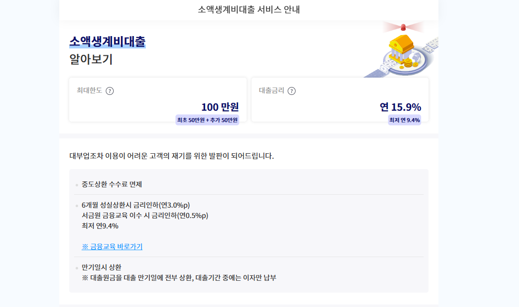 소액생계비대출은 대부업조차 이용이 어려워 불법사금융에 의존할 수밖에 없는 고객들의 재기를 돕기 위해 마련된 정책서민상품입니다. 이 대출은 신용평점 하위 20% 이면서 연소득 3,500만원 이하인 분들을 대상으로 합니다.