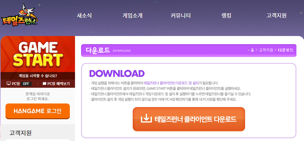 한게임 테일즈런너 다운로드 및 설치 방법